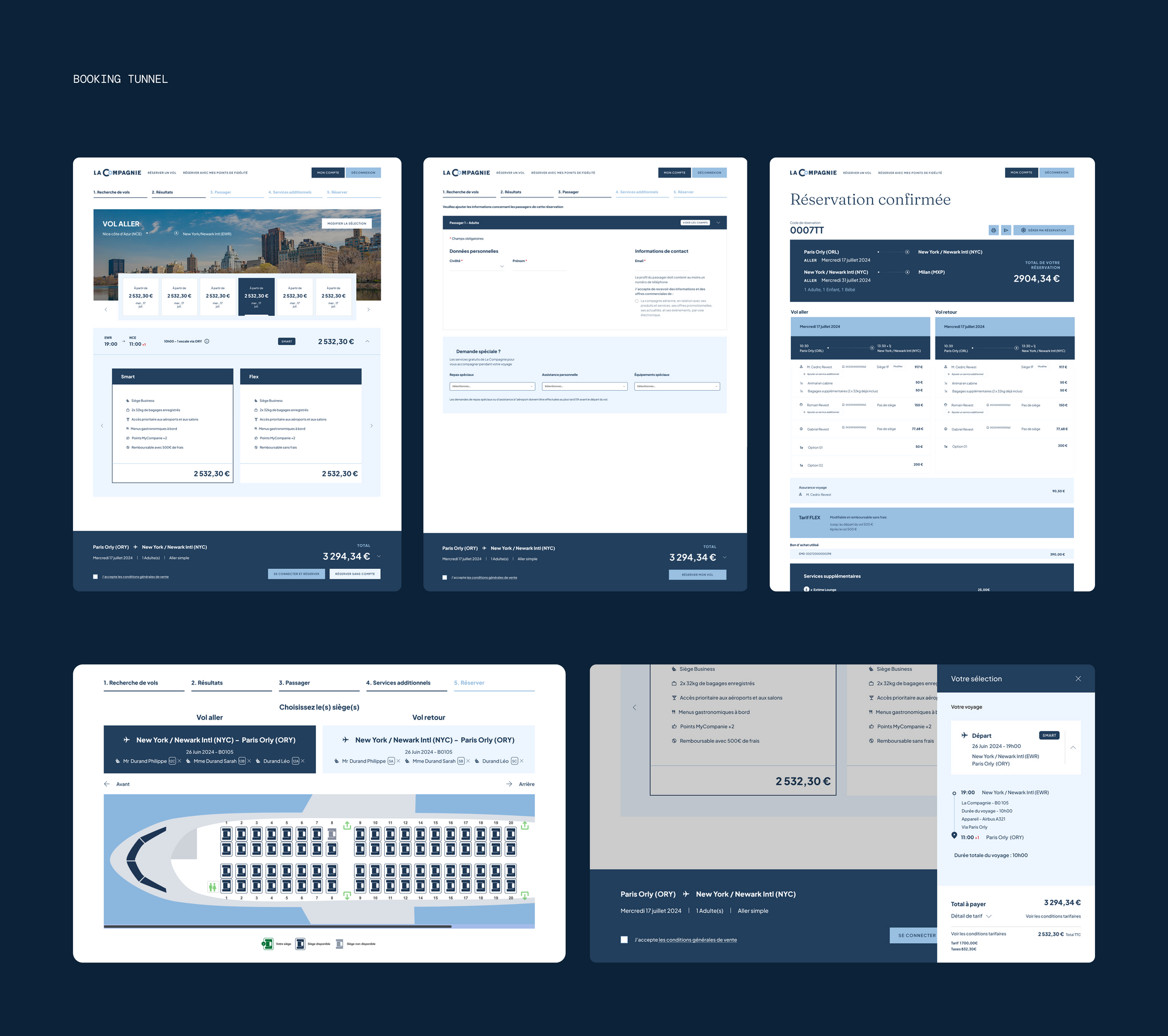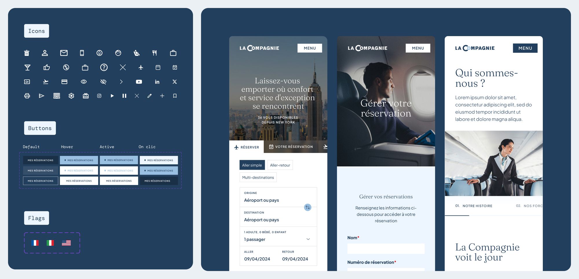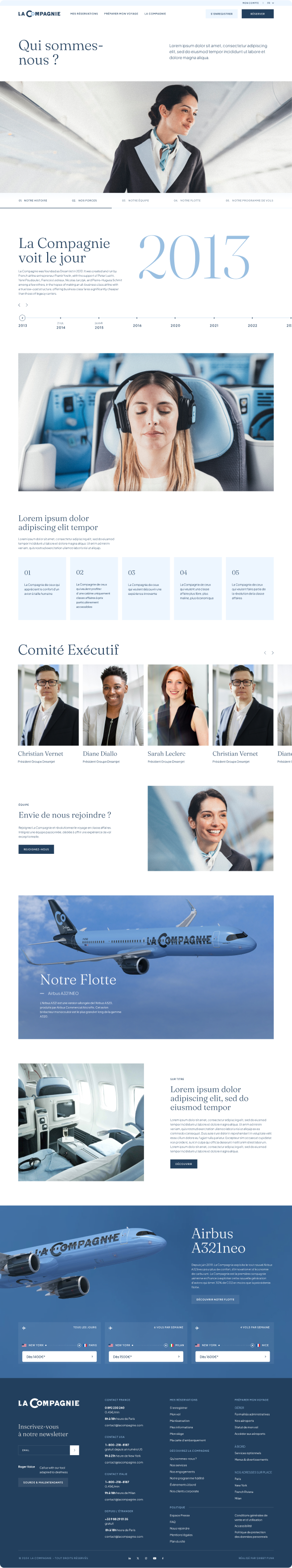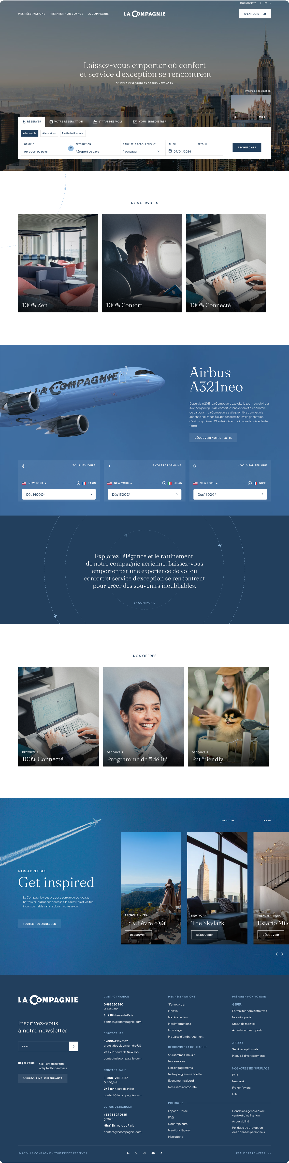 La Compagnie is a French airline specializing in business class flights. As an emerging player in the aviation sector, it positions itself with the ambition of offering a premium experience while remaining accessible. This vision is reflected in the redesign of its digital identity, conceived to embody both elegance and simplicity. The new website embraces a clean, intuitive design that emphasizes transparency and comfort throughout the user experience.