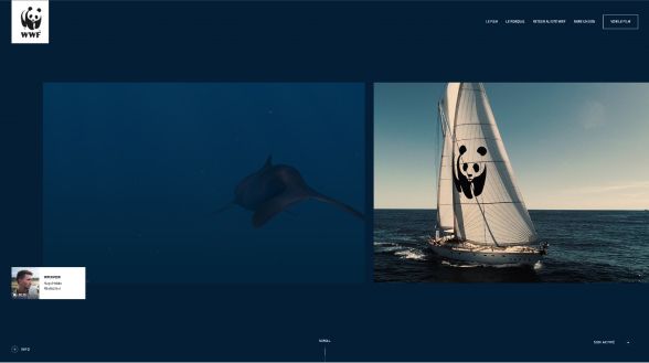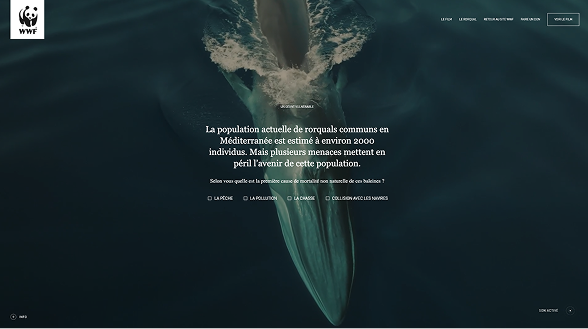 WWF challenged us to create an immersive experience that educates people to the importance of preserving the fin whale in Mediterrannée. Beyond saving an animal, the objective of the documentary is to make people realize the traffic and pollution of this sea. The objective of the site is to discover the animal immersed underwater.
